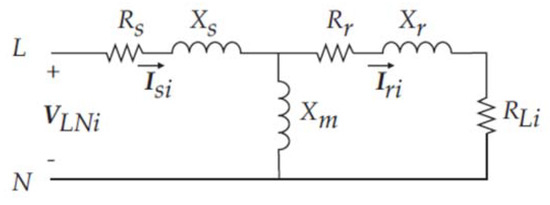 Figure 7 represents both the positive and the negative sequence line-to-neutral circuit models of the three-phase induction generator [21]. In this circuit model, VLNi, Isi, Rs, and Xs represent the line-to-neutral phasor voltages, the line phasor currents, resistance, and reactance of the stator, respectively. Furthermore, Xm is the magnetization reactance, whereas Iri, Rr, and Xr are the line phasor currents, resistance, and reactance of the rotor, respectively. The load resistance RLi is used to represent the transformation of the mechanical power Pmech into active electric power in the rotor of the generator. The positive (resp. negative) sequence model is obtained by setting the value of the subscript i as 1 (resp. as 2) in these quantities.