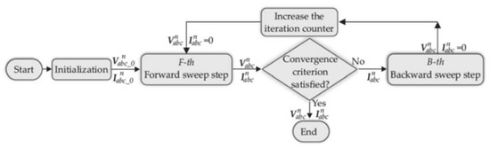 Suppose that the Sor set is known. In addition, consider that the line-to-ground voltages and the total line currents demanded for all the system nodes (i.e., for n = Sor(nFS) and ∀nFS = nb, (nb − 1),…,1) have been initialized, as previously explained in Section 4.1. Based on this information, the FBS method illustrated in Figure 9 is executed, as explained below. The method starts by performing a complete forward sweep step to update the values of and for all system nodes. Once this forward sweep step is completed, a given convergence criterion is verified. If this criterion is satisfied, the FBS method ends. Otherwise, a complete backward sweep step is executed to update only the values for all nodes computed in the previous forward sweep step. Finally, a new complete forward sweep step is newly executed. This iterative process is repeated until the given convergence criterion is satisfied. At this end, the steady-state operating point of the system is known in terms of the values of and . The iterative process shown in Figure 9 is detailed below.