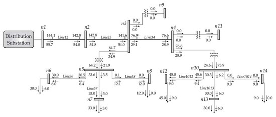 The system loads are in a wye grounded connection and are represented as constant complex powers. Therefore, the values of the proportion coefficients for all the loads are set as α = 0, β = 0, and γ = 1. The rated voltage and the per phase complex power of the system loads are given in Table A3.