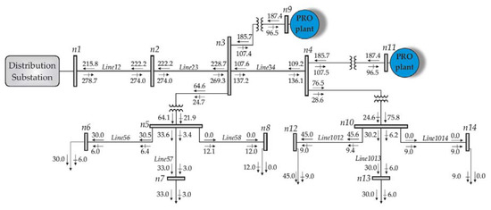 In addition, before executing the FBS method, the mechanical power Pmech produced by the turbine must be evaluated from (56), which will be useful to compute from (63) the currents injected by the PRO power unit along the entire iterative procedure. For this purpose, however, the known values of the salinity concentration Cr (resp. Cm) and the flow rate Qr (resp. Qm) of the river (resp. sea) water at the inlet of the membrane module must first be used to assess the spatial variations of the osmotic and the hydraulic pressures (as explained in Section 3.1). The resulting values are used to evaluate the hydraulic power Phyd from (51). Once Phyd is computed, the turbine mechanical power Pmech is readily obtained from (56). It must be pointed out that the salinity gradient does not depend on the distribution system variables, hence the mechanical power Pmech remains constant to compute the currents injected by the PRO power unit along the entire procedure of the FBS method. However, note from (60) and (63) that the currents injected by the PRO power unit do not remain constant, since they depend on the line-to-ground voltages at the node of connection. Lastly, it is assumed that all parameters involved in (27)–(60) are known.