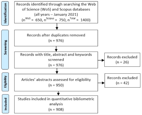 After downloading the search results from WoS and Scopus into Mendeley, they were checked for duplicates. An initial set of total references consisted of 1400 entities, in which Mendeley found 976 unique references. After excluding duplicates, a review of the abstracts of all papers was performed by all authors. During the analysis of the abstracts, non-relevant papers that used the BIM but did not refer to a “building information model” were excluded. Finally, a set of 908 relevant papers were obtained and translated to VOSviewer to develop a keyword map.