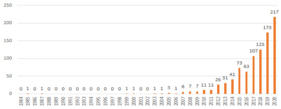 Figure 2 chronologically shows the number of papers published between 1985 and 2020, which totals 908. Consequently, this chronological distribution allows us to answer RQ-1 (“When have BIM and energy efficiency studies been published?”). The following preliminary conclusions can be drawn: research on BIM and building energy efficiency emerged in 1999 and has risen sharply since 2007. Figure 2 illustrates the increasing interest of scholars in this field of research over the past decade.