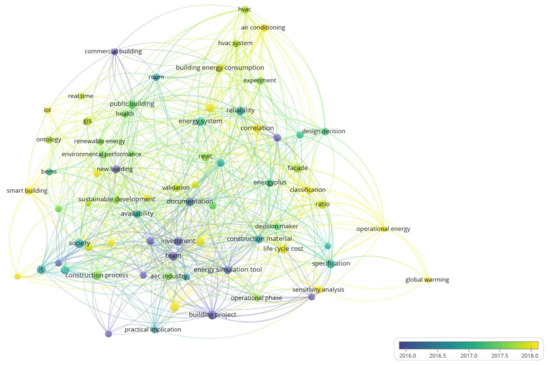 In Figure 3, all keywords are colored according to the average publication year (APY) of the papers in which they occur. As can be seen in the figure, the APY varied in the interval 2015–2018. The newest keywords (RQ-2, RQ-8) were the following: LCA (APY 2018), construction industry (APY 2018), energy simulation (APY 2018), value (APY 2018) and impact (APY 2018). Preliminarily, we can conclude that BIM and building energy efficiency is a relatively new topic, in which energy simulation during a building’s life cycle is particularly relevant.