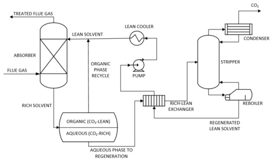 Biphasic or phase-change solvents for acid gas removal are blends in which a liquid–liquid or a liquid–solid mixture formation is exploited to reduce the energy requirements for the solvent regeneration [34]. A solid–liquid equilibrium can be experienced when solvents based on amino acids [35] or amino acids functionalized ionic liquids [28] are exploited and when combining some commercial amine with an organic diluent [36]. The formation of a solid, whose nature depends on the amino acid structure (i.e., zwitterion, potassium bicarbonate), enhances the absorption reaction because the precipitating solvent from the solution forces the equilibrium toward the formation of additional absorption reaction products [35]. However, the presence of a solid phase requires a special plant design dedicated to its handling and its separation from the solution, which results in substantial modifications in the acid gas treatment plants, particularly regarding the absorption column [37,38]. As a consequence, amino-acids-based absorption can be more properly accounted for as an innovative technology rather than simply as innovative solvents for acid gas treatment. For these reasons, this section will be dedicated only to liquid–liquid demixing solvents, which can be employed without special concerns on traditional absorption-based CO2-capture plants. The typical process scheme of the acid gas removal with a biphasic blend is depicted in Figure 2.