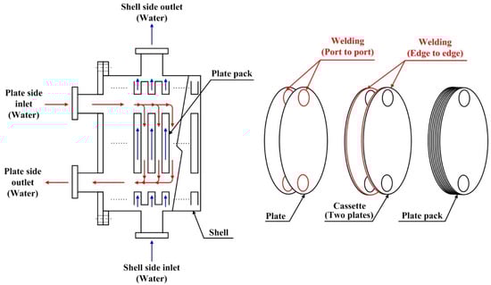 - Jo, C.U.; Lee, D.C.; Chung, H.J.; Kang, Y.; Kim, Y. Comparative evaluation of the evaporation heat transfer characteristics of a low-GWP refrigerant R-1234ze(E) between shell and plate and plate heat exchangers. Int. J. Heat Mass Transfer 2020, 153, 119598. [Google Scholar] [CrossRef]