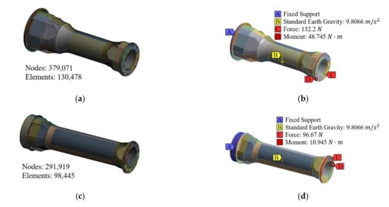 Meshes and load conditions for the FEA model of each link: (a) Upper link mesh; (b) upper link load conditions; (c) lower link mesh; and (d) lower link load conditions.