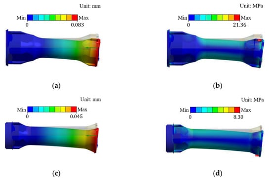 Link stress analysis results: (a) Upper link deflection; (b) upper link equivalent stress; (c) lower link deflection; and (d) lower link equivalent stress.