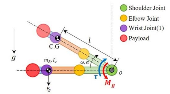 The maximum torque is required when the center of gravity of the rotating body is the position at which the moment caused by gravity is the maximum, and the direction of driving acceleration is opposite to the moment caused by gravity. A free body diagram (FBD) of such a movement in the case of the shoulder joint is shown in Figure 4. Based on the FBD, the maximum torque required for the joint can be expressed using the moment equilibrium equation as shown in (1):