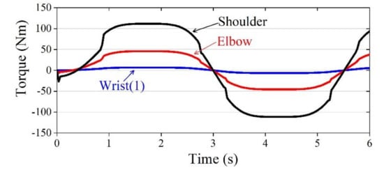 Only three of the six actuators were selected for analysis. Joints were selected based on the consideration that whether or not the gravity acting on the rotating body supported by each joint acts as the load moment of the joint. The joints that satisfy this requirement can be any joint depending on the posture of the robot. However, in the case of the wrist joints, the wrist (1) subjected to the maximum load moment to support the wrist (2), wrist (3), payload all. Therefore, from among wrist joints, we considered only wrist (1) that requires the most torque.