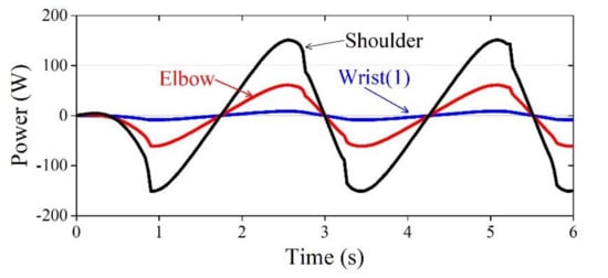 Figure 8 and Figure 9 show the torque and power, respectively, required for each joint as by the analysis. Table 3 lists the maximum required torque and power of the smart actuator derived by rigid body dynamics analysis. However, these are ideal specifications. This is because these specifications do not reflect the effects of lubrication and the viscosity and Coulomb friction effects caused by the contact between the mechanical parts or between the gear teeth of the reducer. Therefore, when determining the specifications of the joint motor, it is necessary to introduce a margin considering the friction effect and reducer loss.