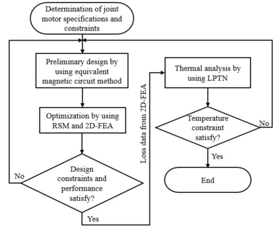 Figure 10 shows the overall design process for the joint motors. In the preliminary design step, the stacking length, air-gap length, and fill factor were determined considering the design requirements and constraints. Several slot and pole combinations were compared considering the electromagnetic and mechanical characteristics to choose the best-suited model for this robot application. To ensure a fair comparison of these slot and pole combination models, we used identical conditions such as the rotor and stator inner/outer diameters, motor axial length, and magnet volume for all models.