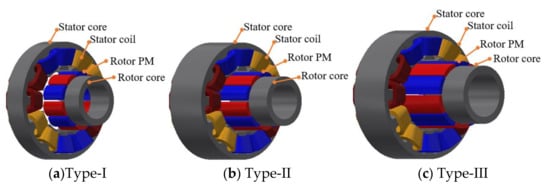 The electromagnetic characteristics of the designed motors were analyzed through 2D-FEA using Maxwell software tool. The overhang effect was considered in the 2D simulation by compensating the permanent magnetic flux density of magnetic materials using the overhang ratio [15,16,17]. The configurations of the final models are shown in Figure 11. As given in Table 5, the cogging torque of all models is less than 1% of the rated torque, and the back-electromotive force (back-EMF) value is smaller than the input voltage within the maximum operating speed range. Therefore, the electromagnetic design requirements are met.