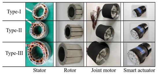 The main design requirements of the joint motor used in the joint robot with the 5-kg payload are listed in Table 4. Based on the torque and power calculated by the rigid body dynamics analysis, we determined the power requirement specifications of the joint motor considering the mechanical losses, margin, and the efficiency of the reducer. The joint motors to be used for the smart actuators of the wrist, elbow, and shoulder joints were defined as Type-I, Type-II, and Type-III, respectively.