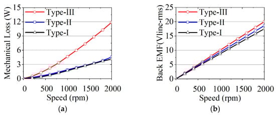 Figure 13 shows the back-EMF and mechanical loss according to the speed as measured through the no-load test. The back-EMF increases linearly with speed, and there is no significant difference between the measured values of the prototypes and the analysis values of the design models (see Table 8). Therefore, all prototypes were regarded as designed and built within a range that does not significantly affect the output performance. The mechanical loss increased nonlinearly with speed, and at the rated speed, the mechanical loss accounted for about 4–7% of the rated power. This value was not considered a loss or heat source in the motor design process. This added value serves to reduce efficiency and increase the temperature.