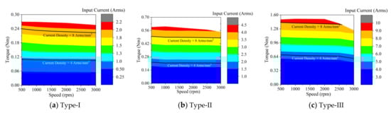 The input and output characteristics of each prototype were measured with variations in speed and load. The speed was measured up to 3000 rpm, and the load was measured up to the rated torque of each prototype. Figure 14 shows the input current map to obtain the load torque according to speed. The input current map shows that the relationship between the torque and current remains almost linear at all test points, including the operating points above the rated conditions.