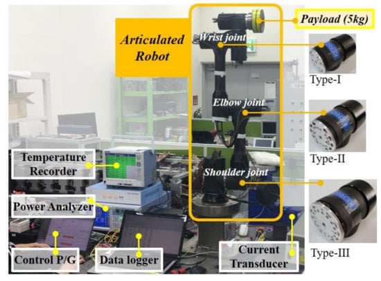To apply the manufactured joint motor to an articulated robot system and test its performance, three types of smart actuators classified by capacity were manufactured. The smart actuator was manufactured by assembling a harmonic drive with a reduction ratio of 1:101 to a joint motor. Then, the manufactured smart actuators were assembled with the links to complete a 6-DOF articulated robot. Figure 16 shows a performance test system for a smart actuator as applied to an articulated robot system. A maximum payload of 5 kg was applied for comparative analysis with the results of the rigid body dynamics analysis. In addition, the motion, operating speed, and acceleration of each joint were set in the same manner as for the rigid body dynamics analysis. The tests were performed on the shoulder, elbow, and wrist (1) joints.
