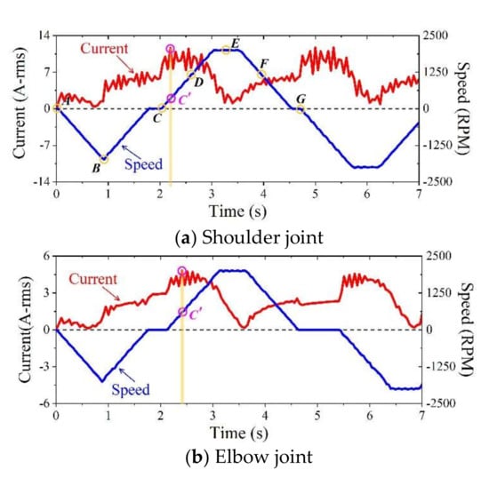 The manufactured smart actuator did not have a built-in sensor to measure torque and force. Therefore, the input current and the operating speed were measured, and the torque of the joint motor was estimated according to the relationship between the input current, the speed, and the torque, as shown in Figure 14. The torque of the smart actuator was estimated using the relational expression between the torque of the joint motor and the reduction ratio of the harmonic drive [25]. Figure 17 shows the phase input current and speed profiles as measured by the joint motors inside each smart actuator. To estimate the maximum torque of each joint motor, the torque value was obtained by associating the current at the maximum input current and the speed value at that time with reference to Figure 14.