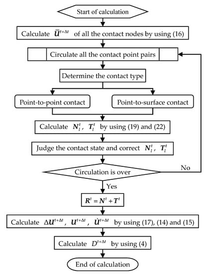 When the movement states of the contact nodes are known at time t, the integration schemes of the movement variables at time t + Δt can be obtained, using the explicit central difference method to solve Equation (13):