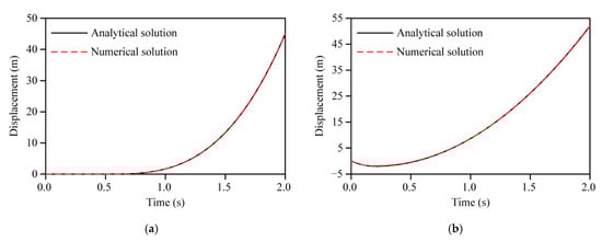 Taking the bottom center of the block as a monitoring point (as shown by the red dot in Figure 5), the velocity and displacement time histories of the block, calculated by the method developed in this paper and the analytical method, are plotted in Figure 6 and Figure 7. In the two calculation cases, the numerical solutions of the velocity and displacement time histories of the block were basically consistent with the analytical solutions. The results show that under the above assumption, the improved dynamic contact force method is feasible, and is suitable for simulating different contact states of a contact system and the large sliding problem for contact interfaces.