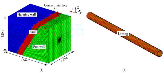Due to the great depth of the tunnel, the number of elements would be very large and the dynamic calculation would take a great deal of time if the 3D finite element model was built to the ground surface. Therefore, a depth of only 55 m was used at the top of the tunnel, to save calculation time. A normal fault with a thickness of 20 m and a dip angle of 60° was considered, with an inclination parallel to the tunnel axis. The finite element model was composed of 69,888 rock mass elements, 17,472 fault elements, and 8640 lining elements, all of which were eight-node hexahedrons, as shown in Figure 8. The maximum mesh size was within 5 m, which satisfies the accuracy requirement of the dynamic calculation. The initial contact node pairs were set between the hanging wall, the fault, and the footwall, respectively. It should be noted that the contact interface between the concrete lining and the fault or the rock mass was not considered.