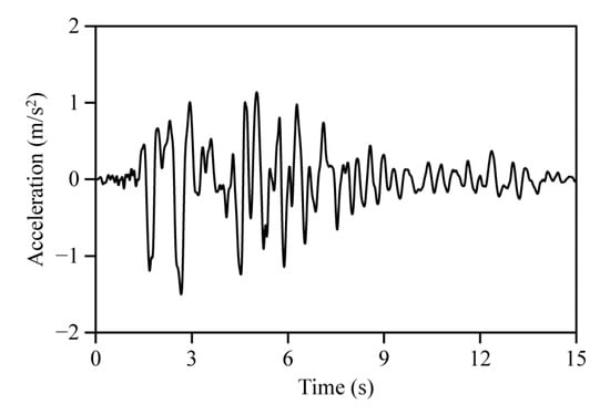 In this study, a representative Kobe NS wave was selected for input to the model in the form of acceleration time histories. A duration section of 15 s with high amplitude was adopted to shorten the calculation time. Then, the amplitude of the input wave was adjusted to 0.15 g to meet the requirements of seismic fortification intensity and the amplitude reduction of a deep tunnel. The processed acceleration time histories are shown in Figure 9, where only the x-direction seismic excitation is considered.