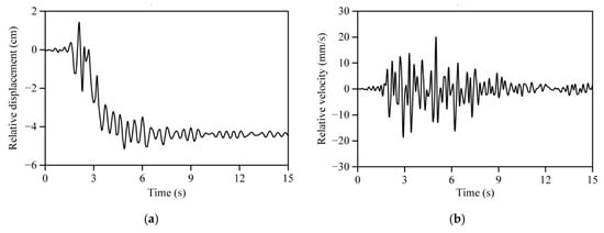 We can see from Figure 10a that the relative displacement of the contact interface was very small at time 0–1.5 s, and it fluctuated violently and increased sharply at time 1.5–6.0 s. The maximum relative displacement was −5.14 cm, appearing at time 4.9 s. After time 6.0 s, the relative displacement basically remained at −4.40 cm. This indicates that the movements of the rock mass and the fault were not synchronous under a large seismic action, and an obvious dislocation displacement appeared between them. That is to say, the rock mass and the fault were in a sliding contact state after time 6.0 s. We can see from Figure 10b that the relative velocity of the contact interface presented similar fluctuating change laws, due to the fluctuation of the input wave: the relative velocity fluctuated violently at time 1.5–6.0 s and fluctuated gently after time 6.0 s.