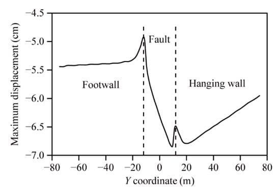 We can see from Figure 13 that the maximum displacements of the haunch at different y coordinates of the footwall were basically the same. From the footwall to the fault, the displacement decreased sharply at the contact interface, and increased rapidly at the fault. From the fault to the hanging wall, the displacement appeared to change suddenly at the contact interface, decreasing slowly at the hanging wall. This indicates that the displacement of the lining was greatly affected by the fault dislocation, especially near the contact interface. Compared with the lining at the footwall, the fault was more likely to affect the lining at the hanging wall, which was characterized by a larger displacement.