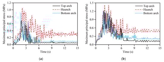 We can see from Figure 14 that the changing laws of the maximum principal stress of the three typical parts were basically the same: the stress increased slowly at time 0–1.5 s, then changed and increased rapidly at time 1.5–6.0 s, changing little after time 6.0 s. On the whole, the tensile stress of the haunch was larger than that of the other parts. The maximum tensile stress of the lining was 1.05 MPa when the dynamic interaction between the rock mass and the fault was ignored, while the value was 1.43 MPa when the dynamic interaction was considered, which is clearly larger than that in the former case. In addition, when the dynamic interaction was considered, the maximum tensile stress of the haunch reached the tensile strength of concrete, and the haunch may then suffer damage. This indicates that the stress of the lining is greatly affected by the dislocation displacement between the rock mass and the fault.