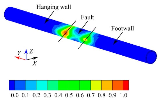 We can see from Figure 15 and Figure 16 that the damage area of the lining was mainly distributed in a certain range near both sides of the fault and at the parts where the fault passes through, especially at the haunch. From the footwall to the fault, the damage coefficient of the haunch first increased and then decreased. From the fault to the hanging wall, the damage coefficient of the haunch also first increased and then decreased. Compared with the other parts, the damage to the lining at the contact interface between the rock mass and the fault was the most serious. Compared with the contact interface between the footwall and the fault, the damage to the lining at the contact interface between the hanging wall and the fault was more serious. The local damage coefficient of the haunch at this part was close to 1.0, and the haunch may then crack. Based on the above analysis, the influences of fault dislocations should be considered in the seismic design of a tunnel structure through a fault, from the perspective of engineering safety. In addition, according to the distribution length of the damage area of the lining, the longitudinal layout range of seismic fortification for the tunnel structure can be determined.