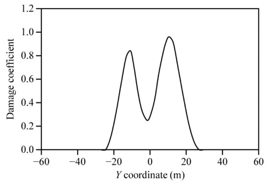 According to the above analysis, tensile damage appears on the lining when the dynamic interaction between the rock mass and the fault is considered. Based on the damage constitutive relation of concrete, the distribution of the damage coefficient of the lining structure after the earthquake can be obtained, as shown in Figure 15, and the changing laws of the damage coefficient of the lining haunch along the tunnel axis after the earthquake are plotted in Figure 16.