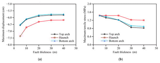 We can see from Figure 17 that as the fault thickness increased, the maximum displacements of the three typical parts decreased gradually, tending to be stable when the thickness exceeded 30 m. Similarly, the changing of the maximum tensile stresses with fault thickness showed the same laws. This is mainly because the larger the fault thickness, the farther the lining monitoring section from the contact interface between the rock mass and the fault, so that the influence of the fault dislocation on the monitoring points is smaller. When the fault thickness exceeds a certain size, the influence of the fault dislocation on the monitoring points can be ignored. It should be noted that the maximum tensile stress of the haunch reached the tensile strength of concrete when the fault thickness did not exceed 20 m, and this part may then suffer damage. Furthermore, we can see from Figure 18 that as the fault thickness increased, the damage coefficient of the lining haunch decreased gradually, remaining at zero when the thickness exceeded 30 m.