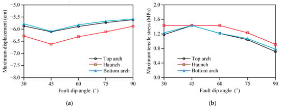 The maximum displacements and maximum tensile stresses of the lining monitoring points under different fault dip angles are plotted in Figure 19, and the damage coefficients of the haunch monitoring point under different fault dip angles are plotted in Figure 20.