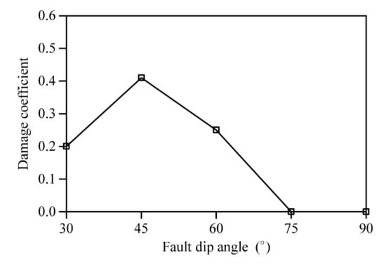 We can see from Figure 19 that as the fault dip angle increased, both the maximum displacements and maximum tensile stresses of the three typical parts first increased and then decreased, reaching a maximum at 45°. This indicates that the fault dip angle had a great influence on the seismic response of the lining monitoring section. It should be noted that the maximum tensile stress of the haunch reached the tensile strength of concrete when the fault dip angle did not exceed 60°, and this part may then suffer damage. Furthermore, we can see from Figure 20 that as the fault dip angle increased, the damage coefficient of the lining haunch first increased and then decreased, reaching a maximum at 45°. When the fault dip angle exceeded 75°, the damage coefficient of the lining haunch remained zero.