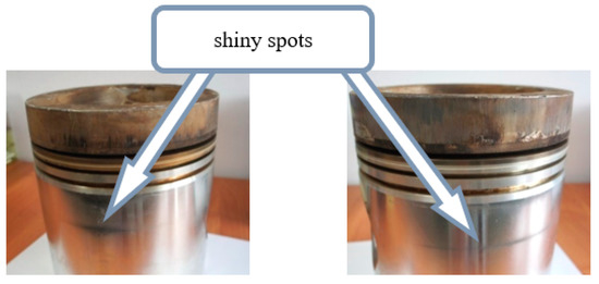 The investigations were performed on a V-16 Waukesha P9390GL gas engine. The engine failed and stopped permanently. The tested piston had shiny spots on its skirt. The shiny spots were located on the level of the kingpin bore and under the lower ring (Figure 2). The described traces were more intense on the side on which the piston leans in the piston sleeve. In addition, in this part of the piston, there was more carbon fouling on the piston crown. The liner of the cylinder sleeve in contact with the piston had small scratches, no different from the effect of a properly operating piston [41].