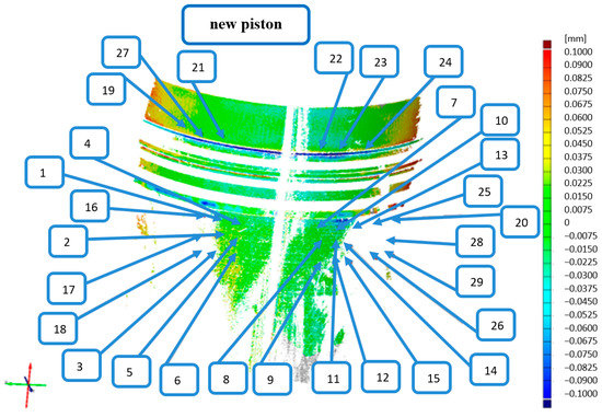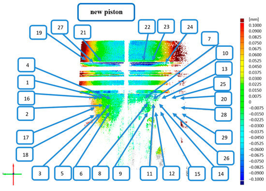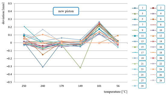 By taking into account the change of temperature of the pistons for different measurement points, it was possible to determine the deviations. The reference measurement in this case was the measurement at the room temperature (21 °C). The obtained graphs show the effectiveness of the method used—a great spread of deviations with respect to the reference measurement (at the temperature of 21 °C) can be observed at the individual measurement points of the worn piston.