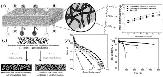 The inherent incompatibility of charged and uncharged polymers in a nanofiber composite membrane may reduce the membrane’s mechanical strength and may increase gas crossover due to small gaps, for example, between PPSU reinforcing fibers and the PFSA matrix. To address that issue, Sood, et al. [60] prepared reinforced membranes with low equivalent weight (EW) Aquivion PFSA and reinforcing nanofibers of 4-heptyl-1,2,3-triazole functionalized polysulfone (PSUT). Improved adhesion was observed of the two polymer components through ionic and hydrogen bonds between sulfonic acid sites of the ionomer and the triazole groups of PSUT. Water swelling, dimensional stability, mechanical strength and Young’s modulus of the resulting composite membrane in room temperature water was improved, as compared to a composite membrane with non-functionalized polysulfone reinforcing fibers, without a reduction in proton conductivity, i.e., although some sulfonic acid groups were interacting with triazole moieties on the reinforcing fibers, there was a sufficient number of fixed charges in the Aquivion ionomer matrix for facile proton conduction. An open circuit voltage durability testing of this membrane was performed in a membrane-electrode-assembly (MEA) with Pt/C electrodes at 90 °C. Durability data are shown in Figure 3e, where a drop in open circuit voltage (OCV) is indicative of membrane pinhole or crack formation. Test results showed that the PSUT reinforced membrane was 5-times more durable than a neat Aquivion film, with no sign of membrane degradation or failure during the 450 h test.
