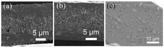 The important advantage of the dual-fiber electrospinning technique is that it is possible to continuously vary the mat composition in the membrane thickness direction by changing the relative flow rates of the ionomer and uncharged polymer solutions during electrospinning. In doing so, one can create layered or gradient membrane morphologies in the membrane thickness direction, which cannot be mimicked by polymer impregnation into a pre-formed fiber mat. Powers et al. [55] were the first to fabricate multilayer and gradient fuel cell membranes by this technique. Membranes containing 3–9 layers were made with 825 EW PFSA where the reinforcing uncharged fibers were spun from polyamidimide (PAI, with the trade name Torlon® from Solvay Specialty Polymers, Greenville, SC, USA). Figure 4a,b show SEM cross-section images of layered and gradient composite membranes. The outer layers of the membrane were PFSA-rich with inner layers that contained more PAI reinforcement. The thickness of the inner layers was adjusted so that the composition of the entire membrane was 80 wt.% PFSA and 20 wt.% PAI. A three-layer 20 µm membrane exhibited significantly reduced in-plane swelling as compared to a solution cast unreinforced 825 EW PFSA membrane (11% vs. 29%). As compared to a single layer membrane with a uniform distribution of PAI fibers in a PFSA matrix, the tri-layer membrane exhibited dramatically less in-plane swelling with no loss in proton conductivity. Gradient structures may be particularly important in some applications because such a morphology eliminates the step-change in ionomer content between sub-layers, thus minimizing the possibility of delamination. Powers et al. showed that membranes with a symmetric gradient distribution of PAI fibers in a PFSA matrix (high PAI fiber content at the membrane centerline and low fiber content at the membrane surface) also exhibited excellent properties, with a through-plane proton conductivity of 0.092 S/cm and an in-plane swelling of 6% (data measured in room temperature water), where the stress at break for an air-dried film was 19.9 MPa.
