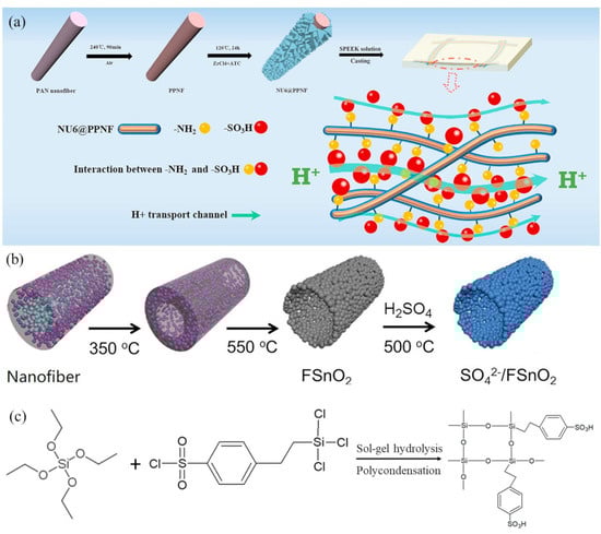 (a) Preparation of NH2-UiO-66 coated fibers. Reproduced with permission from Ref. [63]. (b) Preparation route for sulfated SnO2 hollow nanofibers. Reproduced with permission from Ref. [64]. (c) Sol-gel reaction of precursors TEOS and CSPTC to form a sulfonated silica network. Reproduced with permission from Ref. [19].