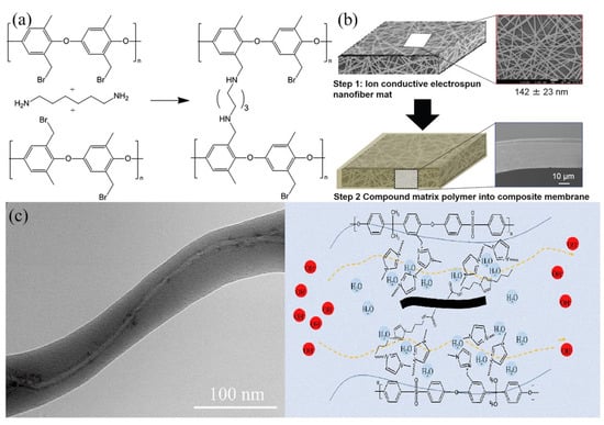(a) Scheme for reacting brominated poly(phenylene oxide) with hexamethylenediamine crosslinker. Reproduced with permission from Ref. [70]. (b) Fabrication process for making a composite membrane with QPAES nanofibers. Reproduced with permission from Ref. [71]. (c) TEM image of an MWCNT-embedded in an electrospun nanofiber and a possible mechanism of hydroxide transport in a MWCNT/IMPS co-electrospun composite membrane. Reproduced with permission from Ref. [72].