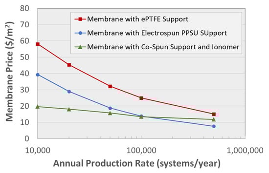 Relationship between composite membranes price and fuel cell stack (system) annual production rate, from an economic study carried out by strategic Analysis, Inc. [88]. All membranes are 14 μm in thickness with 95% Nafion PFSA ionomer. Reproduced with permission from Ref. [88].