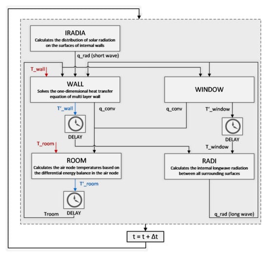 Within this work dynamic building models are used that are based on the nodal method. This method is common for building simulations due to its ability to resemble multi zone buildings. Thereby the principal assumptions are, that each zone is a homogeneous volume that is characterised by uniform state variables where a node can e.g., represent a room, a wall or a window. The thermal transfer equations are solved for each node of the system. Each building model is divided into different parts. The connection between them is realized with internal connectors (inputs and outputs for the blocks, see also Figure 2). The model bases on a one dimensional numerical solution of the heat conduction equation for each wall. Additional nodes resemble room air and windows. Long wave radiation exchange between the room surfaces is also taken into account. Inputs for the model are external boundary conditions (temperature and irradiance). To speed up the model creation process and reduce the computational effort, all buildings are resembled as single zone models with a lower level of geometric detail. To counteract a possible reduction of prediction accuracy by the reduced model detail, a calibration method is applied that is described in Section 2.5.