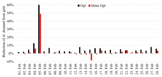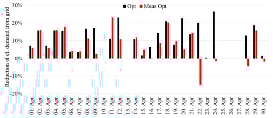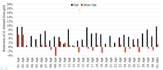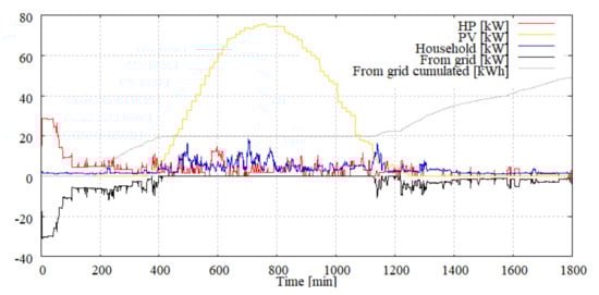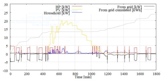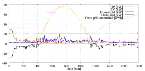 For the daily optimization case of PV self-consumption, the aim is to minimize the accumulated amount of electricity that is drawn from the grid. This helps to (i) reduce demand peaks, (ii) lowers the amount of PV electricity that is feed to the grid and (iii) poses the most economical solution for the building owner as today, the household electricity price in Germany is more than three times as high as the fixed feed in tariff for small (<10 kWp) newly installed PV systems. As such, for PV the fixed price feed in tariff for new systems installed in August 2021 would be 0.736 €/kWh [30] whereas the average household electricity price in Germany in 2021 is 0.33 €/kWh [31]. This results in the following target function for which the result is to be minimized: