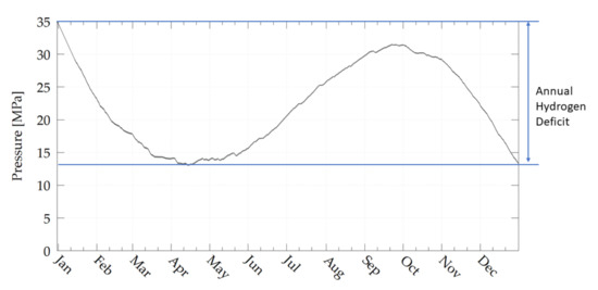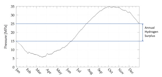 With an assumed energy demand for the hydrogen production of 50 −1 and the targeted storage pressure, the needed cylinder volume is determined.