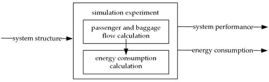 Figure 1. The user must configure the structure of the system as an input variable. Then the simulation model calculates the flow of passengers and their items through the system. Based on this flow, in parallel, the operational state of the devices is checked and the power consumption is counted. Performance and power consumption are given as output variables. The individual components of the model are described in detail in