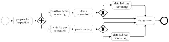 Passengers and baggage move through the system in a FIFO (First In First Out) strategy. In the first stage, preparation for inspection is carried out. Passenger transfers items to be X-rayed. The time it takes is given by the random variable tpr. After this, the passenger and objects await inspection on their flow paths. Here the time is not set by the user. It is derived from the current state of the simulation experiment. To screen the waiting objects, the X-ray must be free from screening other objects. To screen a waiting passenger, WTMD must be free from screening other passengers. Additionally, the current number of passengers in the items claim area must be less than the OUT parameter. So, as a result of the experiment, the simulation model counts passenger waiting time tqp and items waiting time tqi. Once this is in place, passenger screening is conducted according to the time specified by the random variable tsp. The same is true for items and the time of their inspection is determined by the random variable tsi.