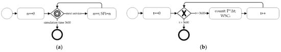 Figure 4a) that, in a loop, waits for a passenger service completion event and adds it to the current value of the SP