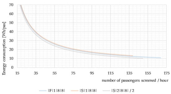 Looking at the results in more detail, interesting insights for the process manager can be seen. For the SH2 device and a single lane, the highest value of power consumption with a low system performance of about 139 pax/h can be observed. The power consumption at the determined system performance is 12.93 Wh/pax. For a double lane, the power consumption at a performance of 300 pax/h is 12.37 Wh/pax. At a double lane, the gaps between passengers passing through the WTMD gates are eliminated, which results in a continuous service stream and, consequently, a lower power consumption value per passenger. In the case of the fast lane system configuration with the performance of 169 pax/h, the power consumption per passenger is 11.13 Wh/pax. In the case of the fast lane, the reduction in power consumption is influenced by the passengers’ behaviour. Fast lane passengers are usually business customers who do not have many pieces of luggage and have full knowledge about the security control process. For stations equipped with SH3, power consumption is slightly lower than for SH2. Regardless of the manager’s choice of screening device (SH1, SH2, SH3), it is more advantageous from a power consumption perspective to configure the screening checkpoint based on dual stations supported by a fast track. It is crucial to ensure a continuous stream of passenger requests. However, because the volume of the service stream varies throughout the day, an extended analysis was performed. The variable value of passengers handled per hour and its impact on power consumption was checked (see