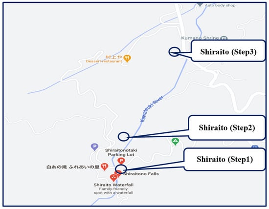 Figure 1 presents the location of these three projects. Step 1 was to restore the wooden water wheel at Shiraito Falls and handcraft a power generation system with students from Kyushu University. The power plant in Step 2 was developed by Kyushu University professors and the Itoshima City Office. It was started in 2012 and completed in 2014. Two turbines have been installed which produce a total of 15 kW. It is located about 200 m downstream of Shiraito Falls [15].