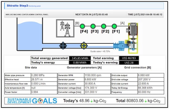 Figure 7 shows the instantaneous real time data of the plant. This picture was taken on 8 April 2021. The output during the rainy season or rich water period was approximately 12 kW, and during the lean period it is about 8 kW. The total energy generated per the data taken on 8 April 2021 is 145.8 MWh. The real time out at that time was 8.06 kW in the grid side and 8.8 kW after generator. The other important parameters are also shown in the real time monitoring panel. The generated energy is sold to the National Grid Power Company in the Kyushu area at the rate of USD 0.32/kWh according to the FIT scheme. The gross income as per the above data is USD 46,783, which is approximately 22.5% of the total construction cost.