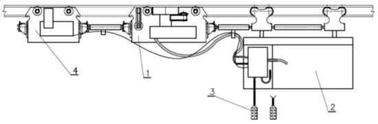 Layout of the suspended battery vehicle (PCA-1) (1—driving trolley, 2—power supply unit, which includes battery bank and necessary auxiliary devices such as control, security, charging systems, electronic systems, etc., 3—control cassettes or alternatively radio remote control panel, 4—braking trolley.